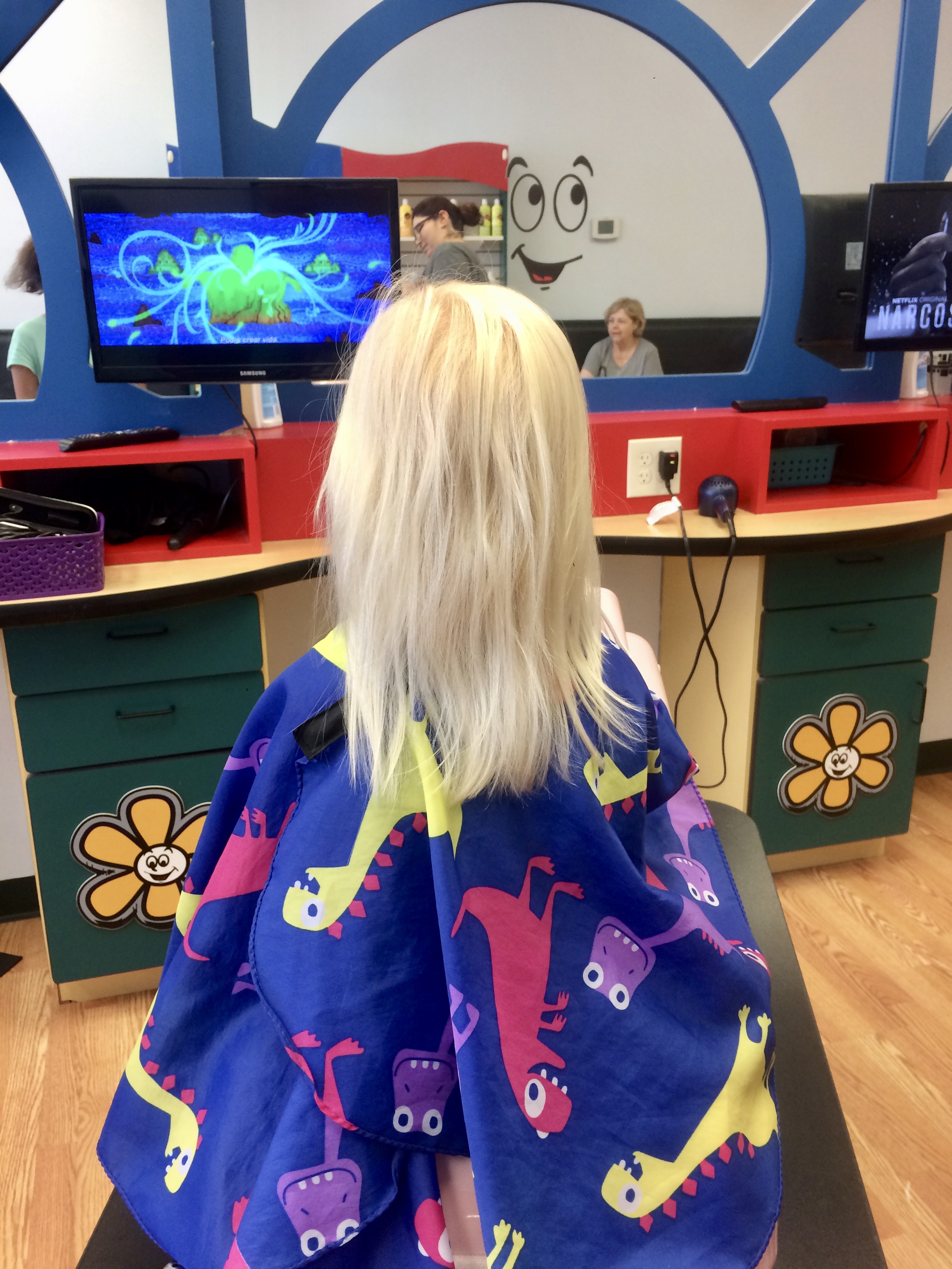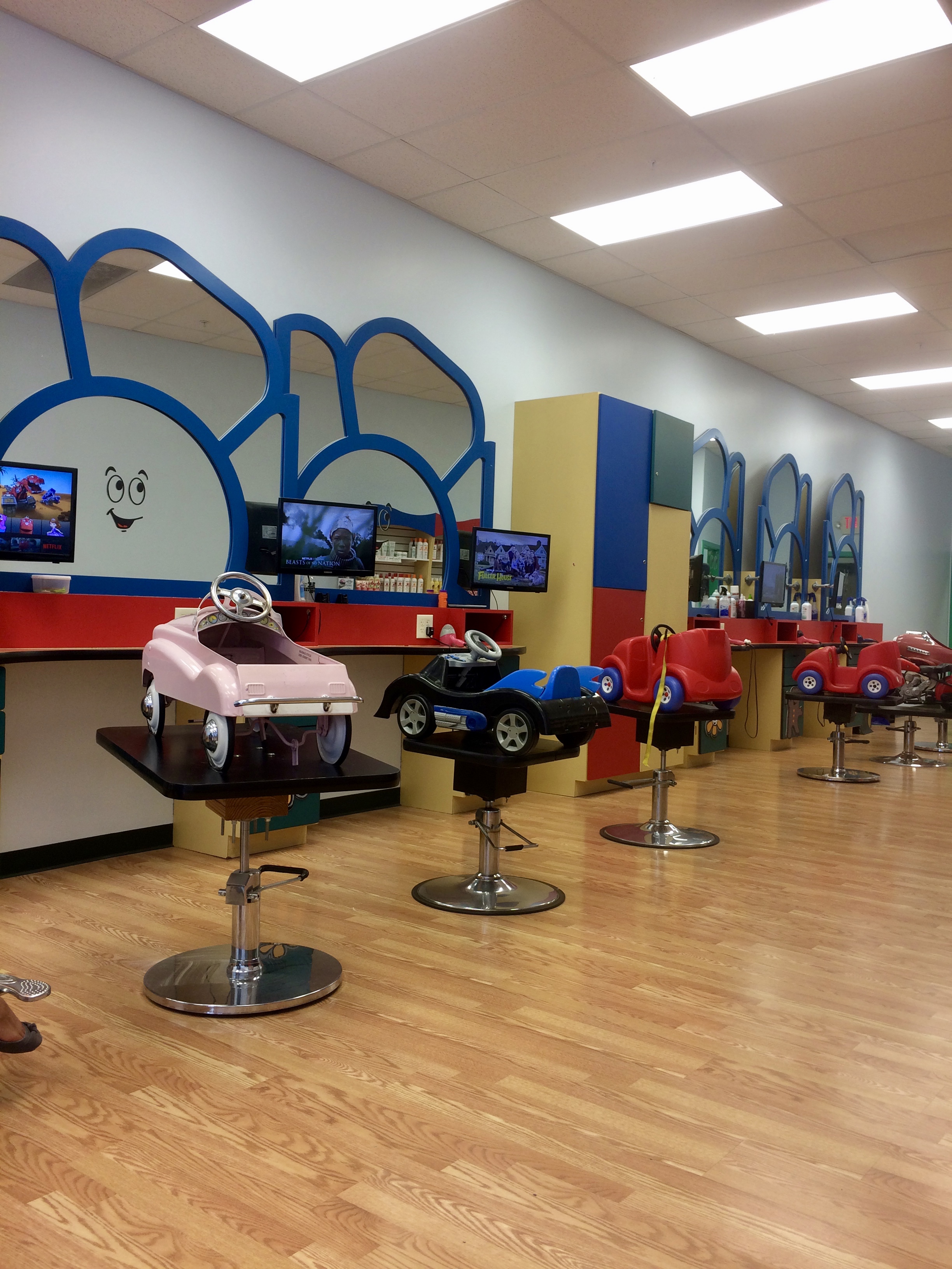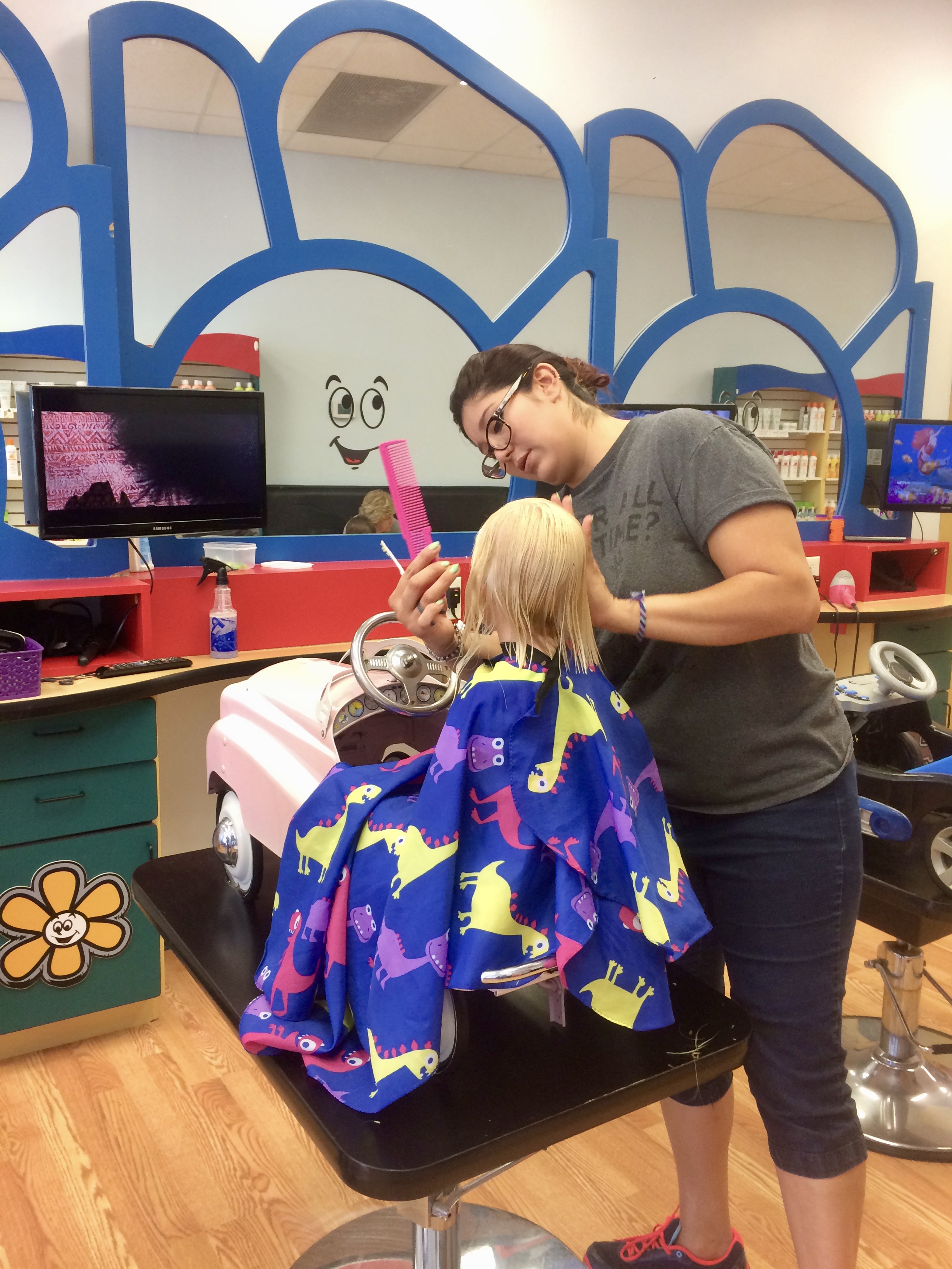At the hair cutting area, they had cars that the kids could sit while getting their hair cut. The mirrors were painted all kid-friendly and each station had a TV for the child to watch while getting their hair cut.