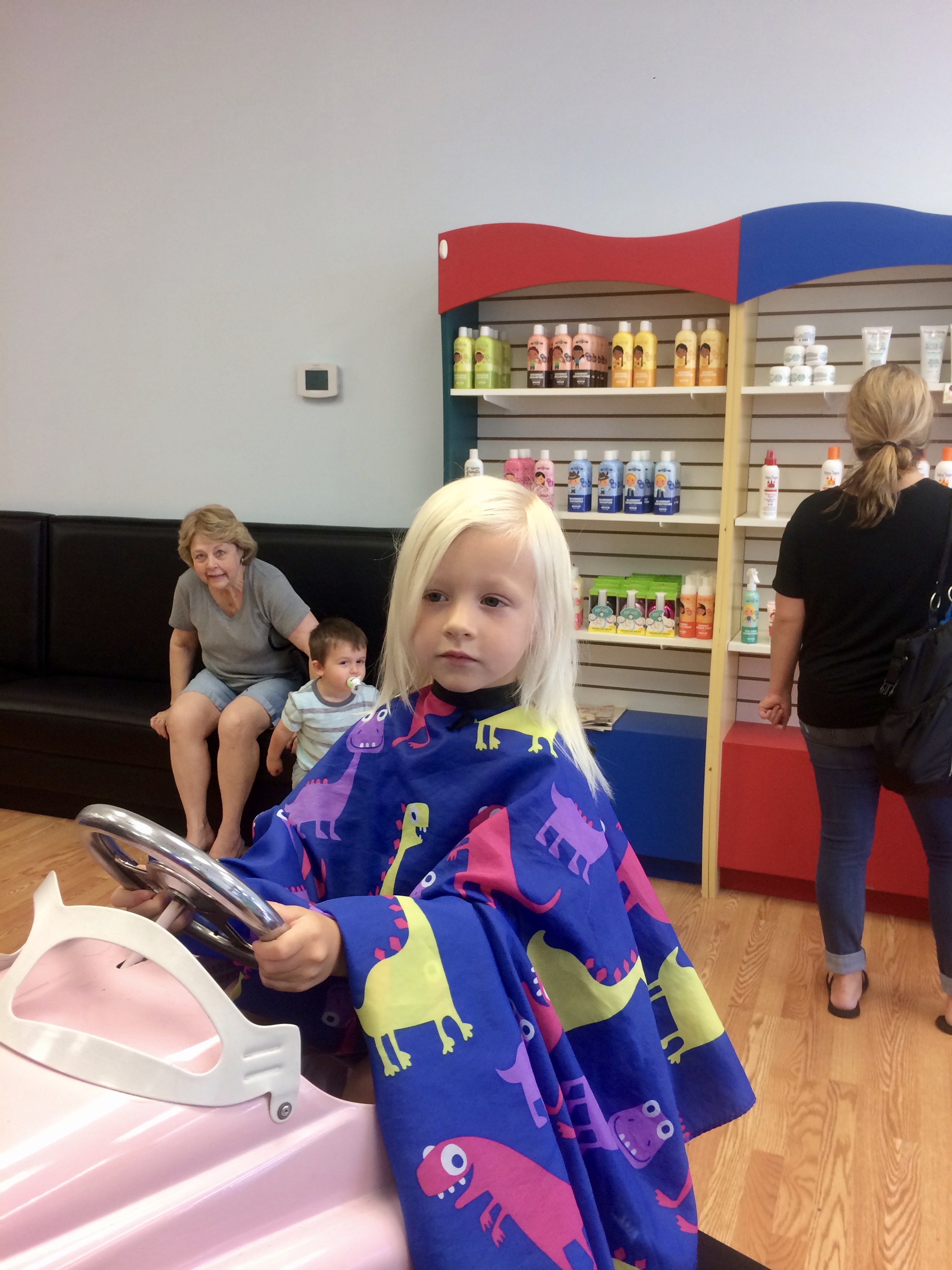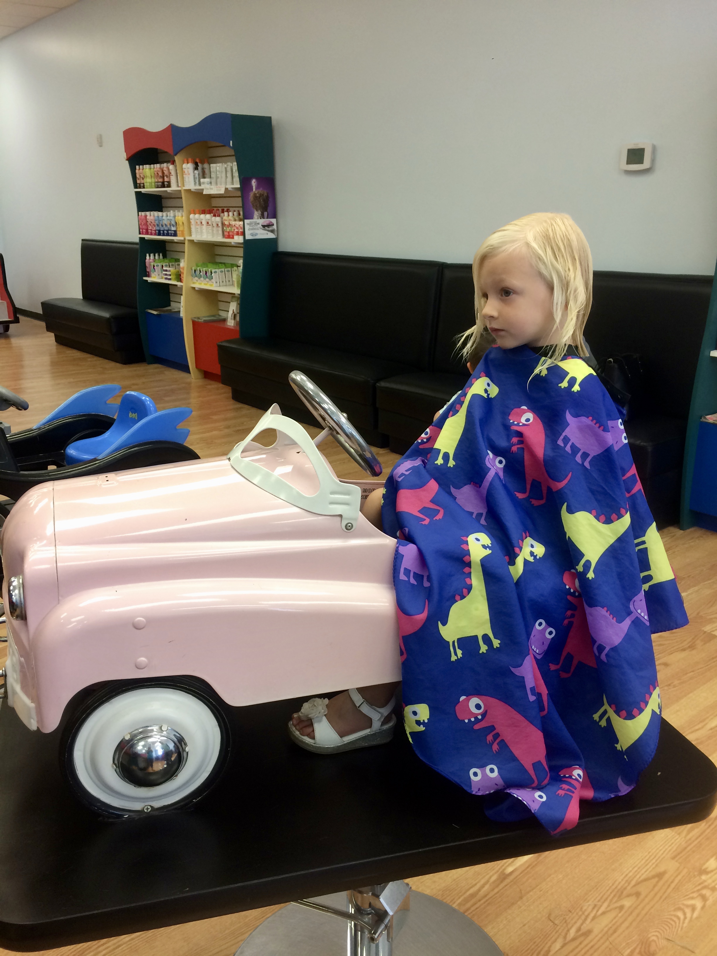 She got this fun apron and got to pick out a hair clip to hold while getting her hair cut.