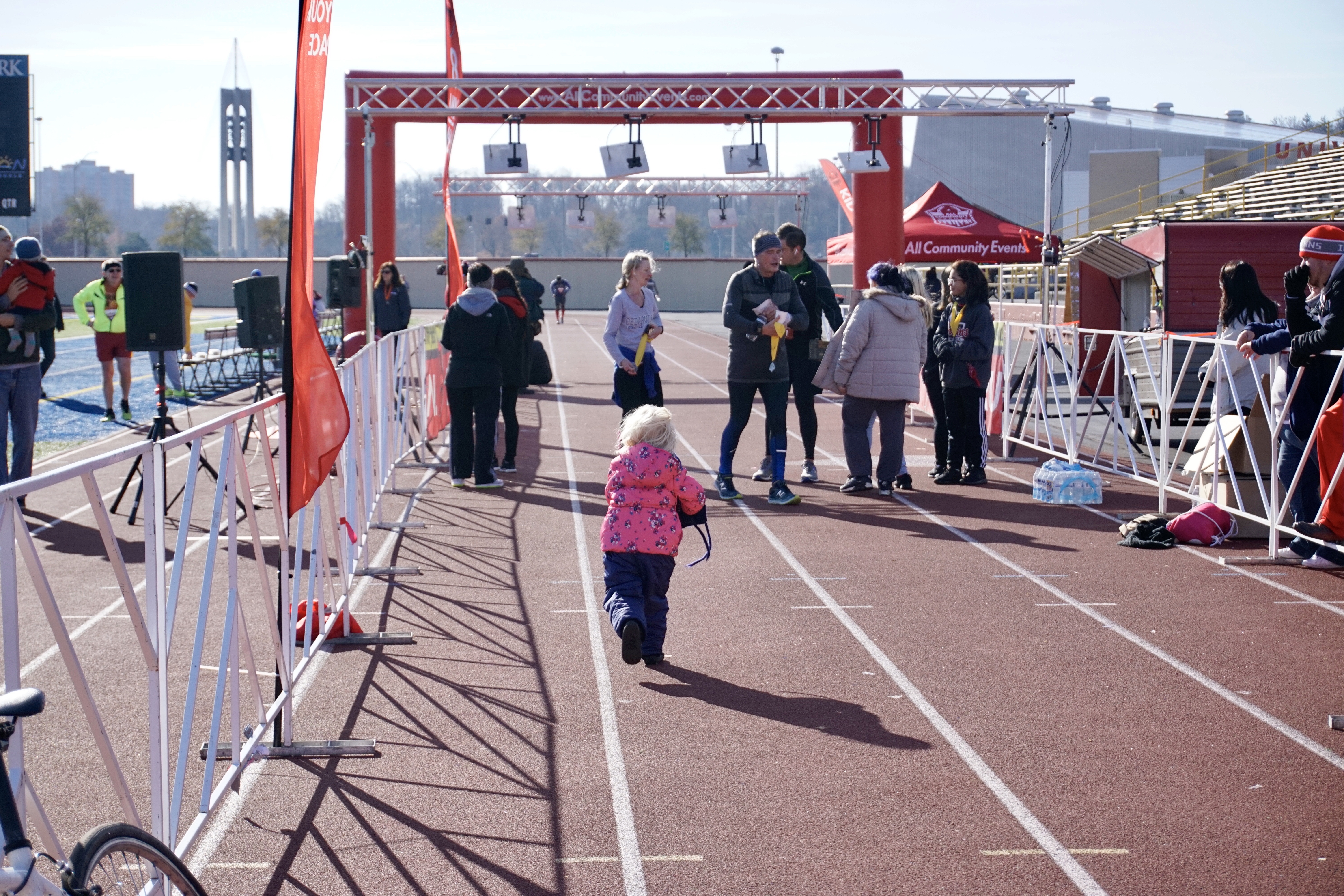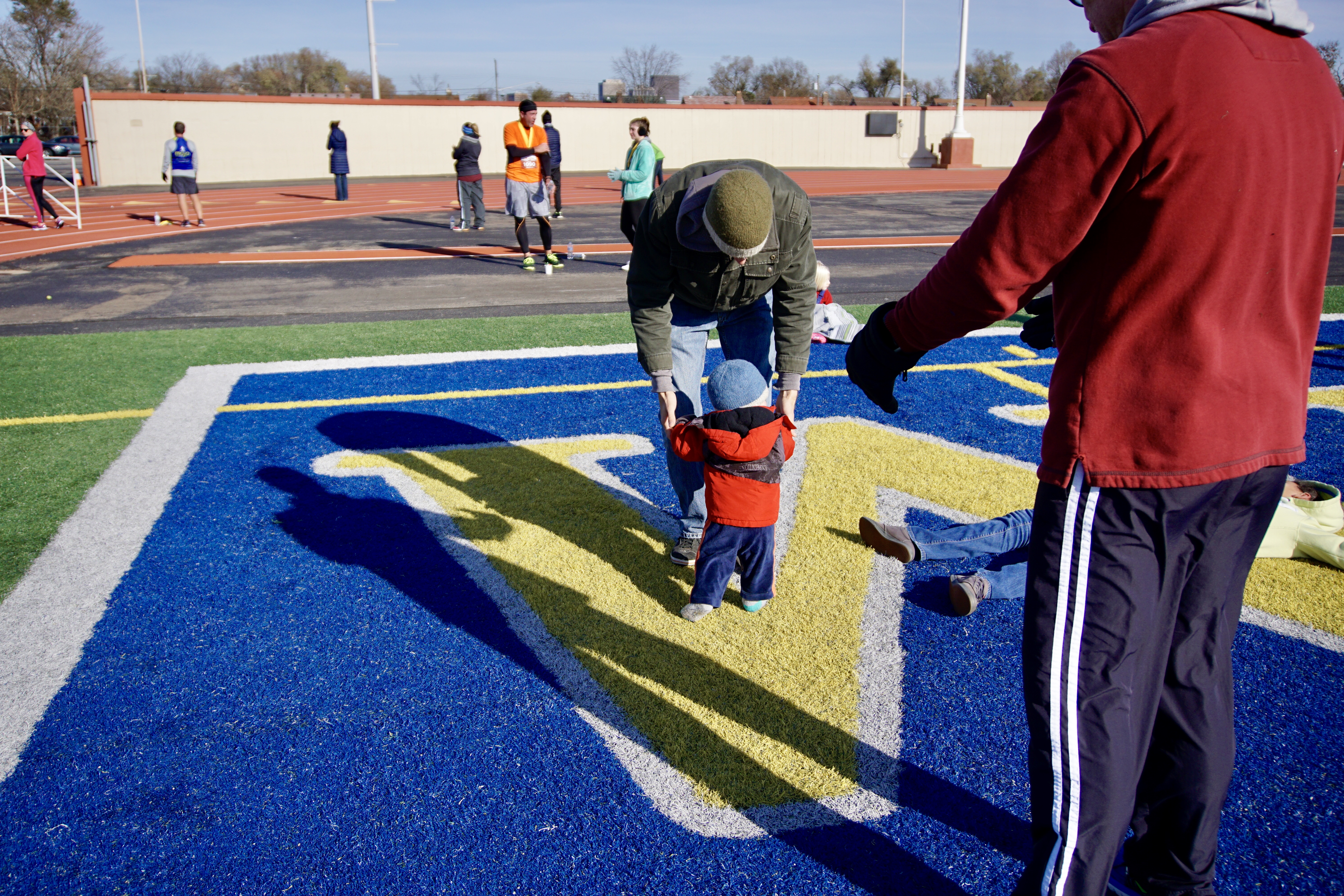 Meanwhile, the rest of the crew headed to the finish line to wait for me to finish. They were trying to get Kiah to take his first steps. No luck there. Also, no idea why Heavenly is laying on ground, but whatevs. You do you, kid.