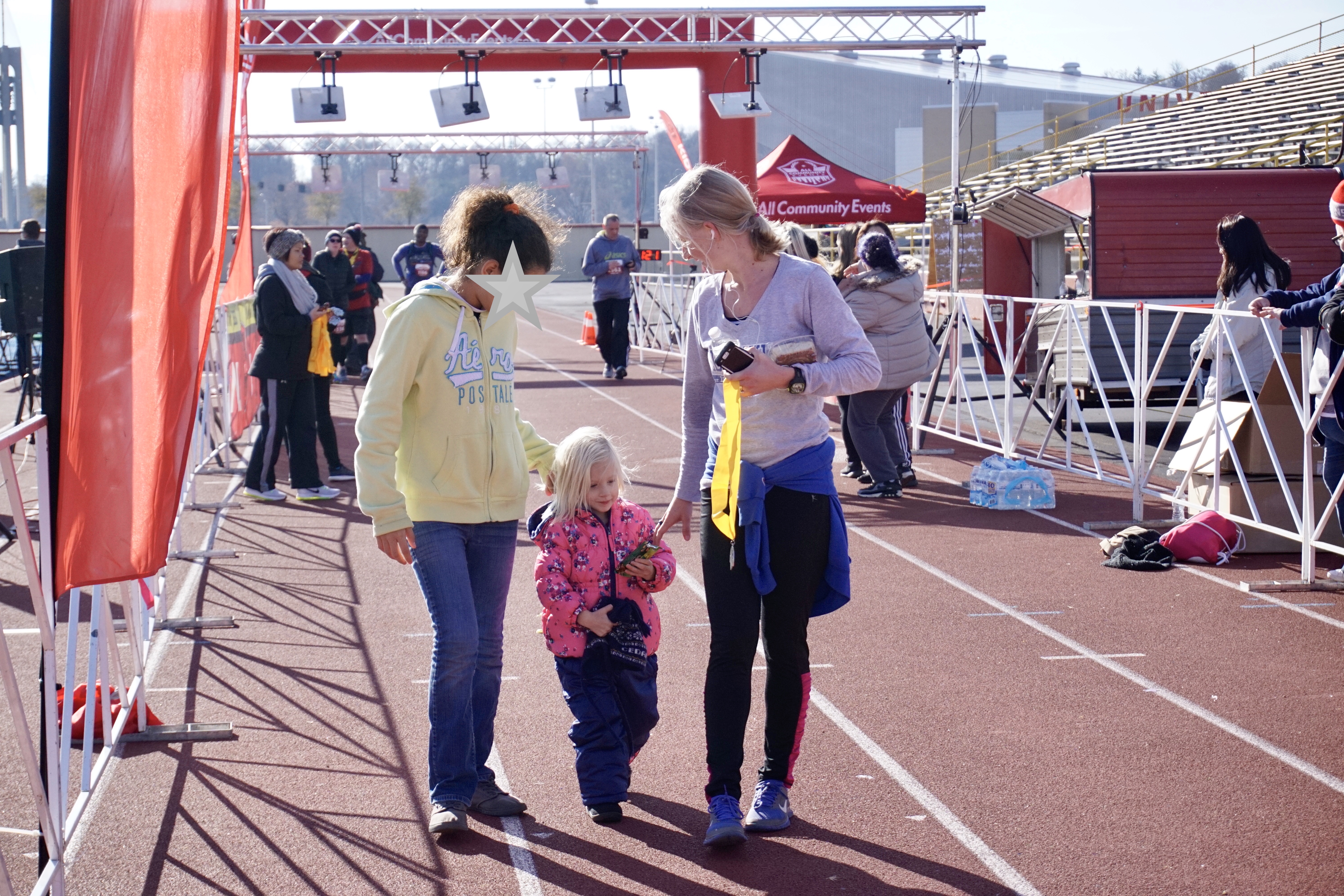 My girls came to meet me! Again, don’t be fooled by the pretty picture…they were both asking me for some of my cinnamon bun, and they were both complaining about being cold and tired and I’m pretty sure someone said “Can we please go home now?” before I had even finished walking out of the chute. LOL. #MomLife