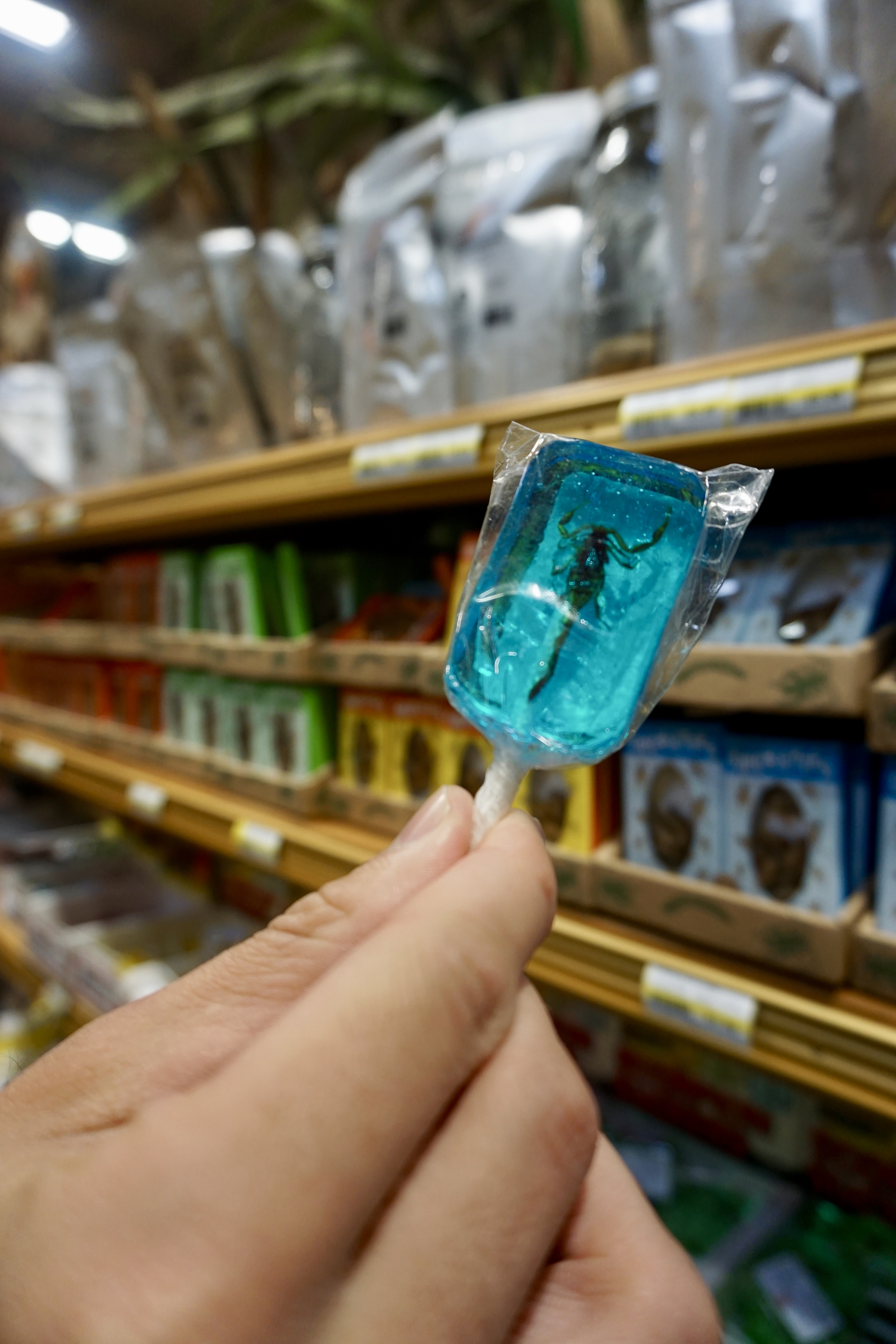 They had a whole shelf of bug food- bug lollipops, bug candies, bug chips, and just plain bugs.