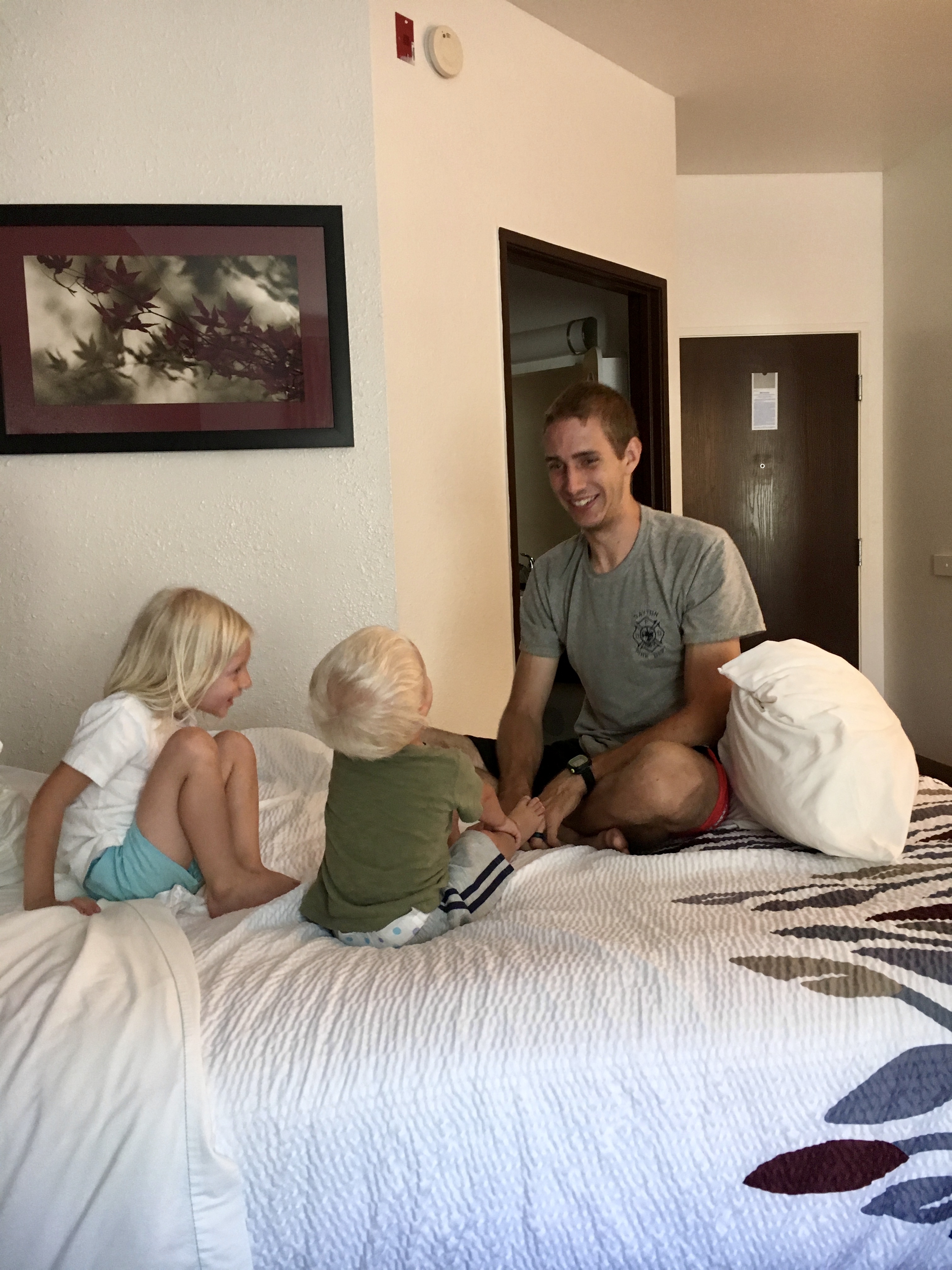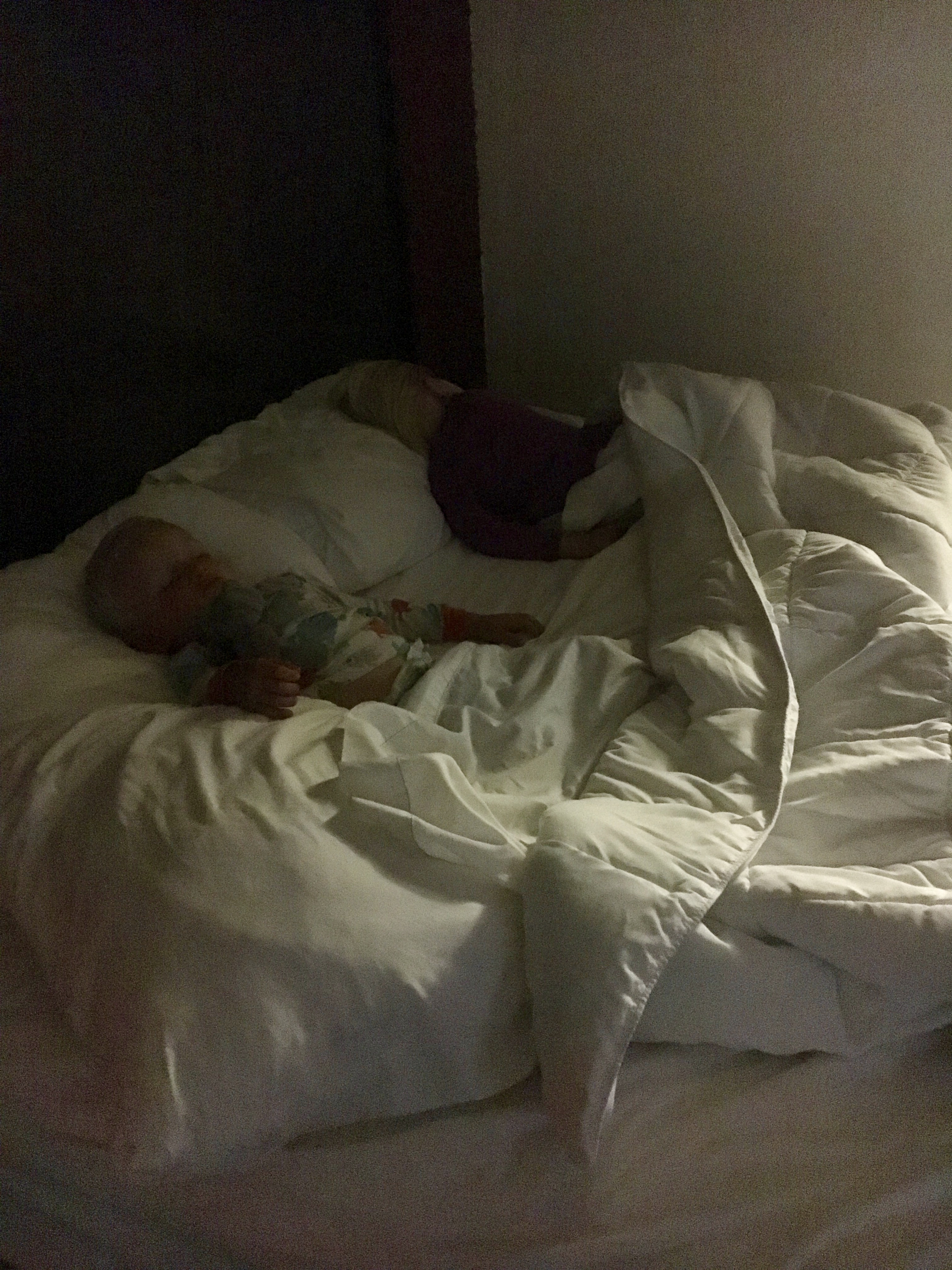 We headed back to the hotel and began the fiasco of trying to get the kids to go to sleep. I took Tera out to the lobby while Theo started to lay Kiah down. Kiah was so tired, I didn’t think it would take too long. 10 minutes passed, then 20, then 30, then 40 when I finally decided to call Theo and see what was taking so long. Poor exhausted Daddy fell asleep within five minutes while Kiah down. LOL. Tera and I read through the entire newspaper and played “Eye Spy” with every single color we could find in the lobby (there were only about five colors in the lobby). Next was Tera’s turn, and she was out within 20 minutes. The two kiddos were so sweet up on their big hotel bed until Kiah rolled right over a pillow and landed on the hard floor. Then the two kiddos were so sweet all snuggled up on the floor with a bed of blankets. Until Kiah stood up in the night next to my head and yelled “MAMA” until I put him into bed with us. The End.