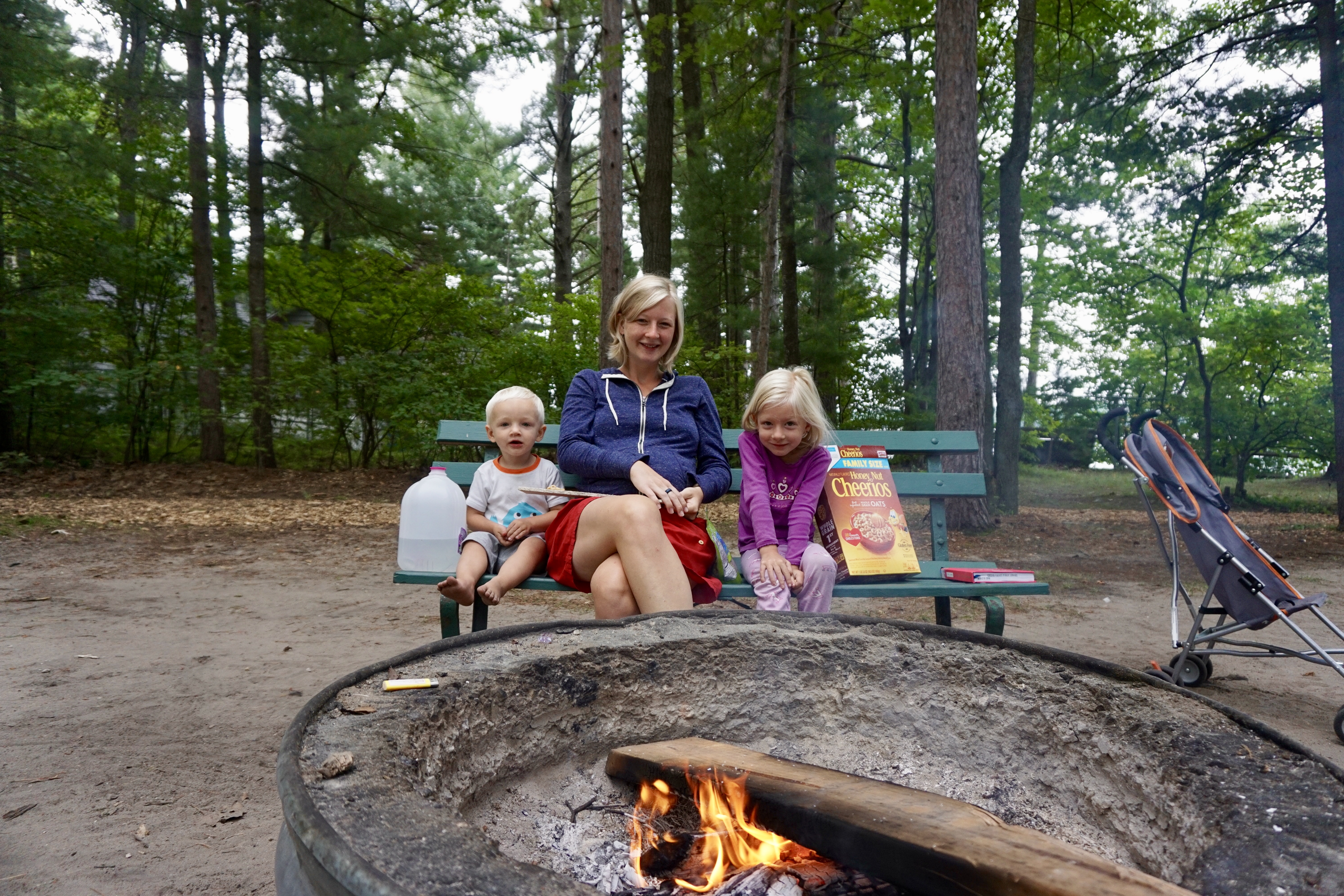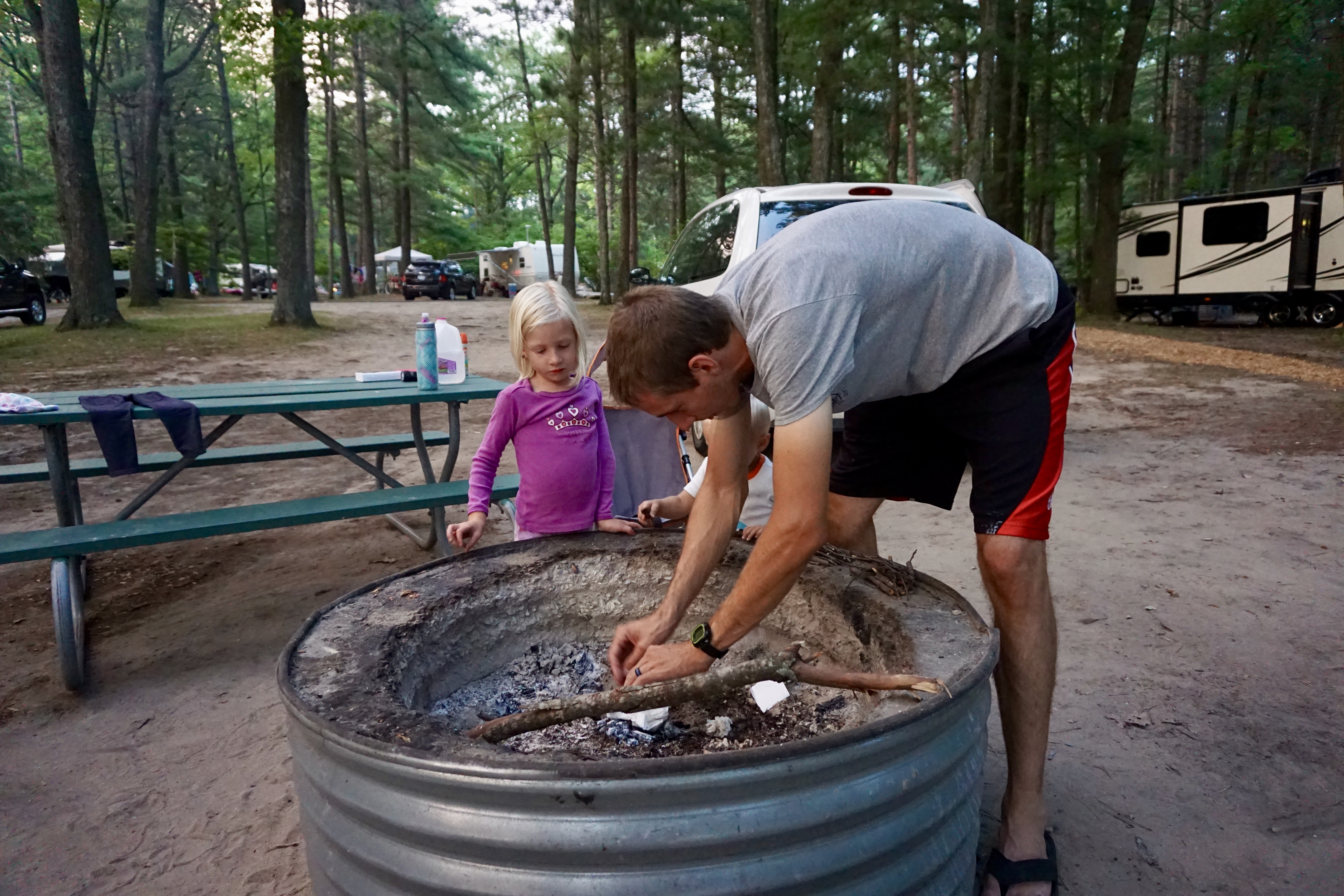 We built a fire and enjoyed sitting around the campfire for a bit before we threw the kids in the back of van to go to sleep. This turned out to be the WORST part of the whole sleeping-in-the-van thing. The kids would not go to sleep. It was northern MI, so it was still light out until nearly 10pm and they just could not settle down enough to sleep.