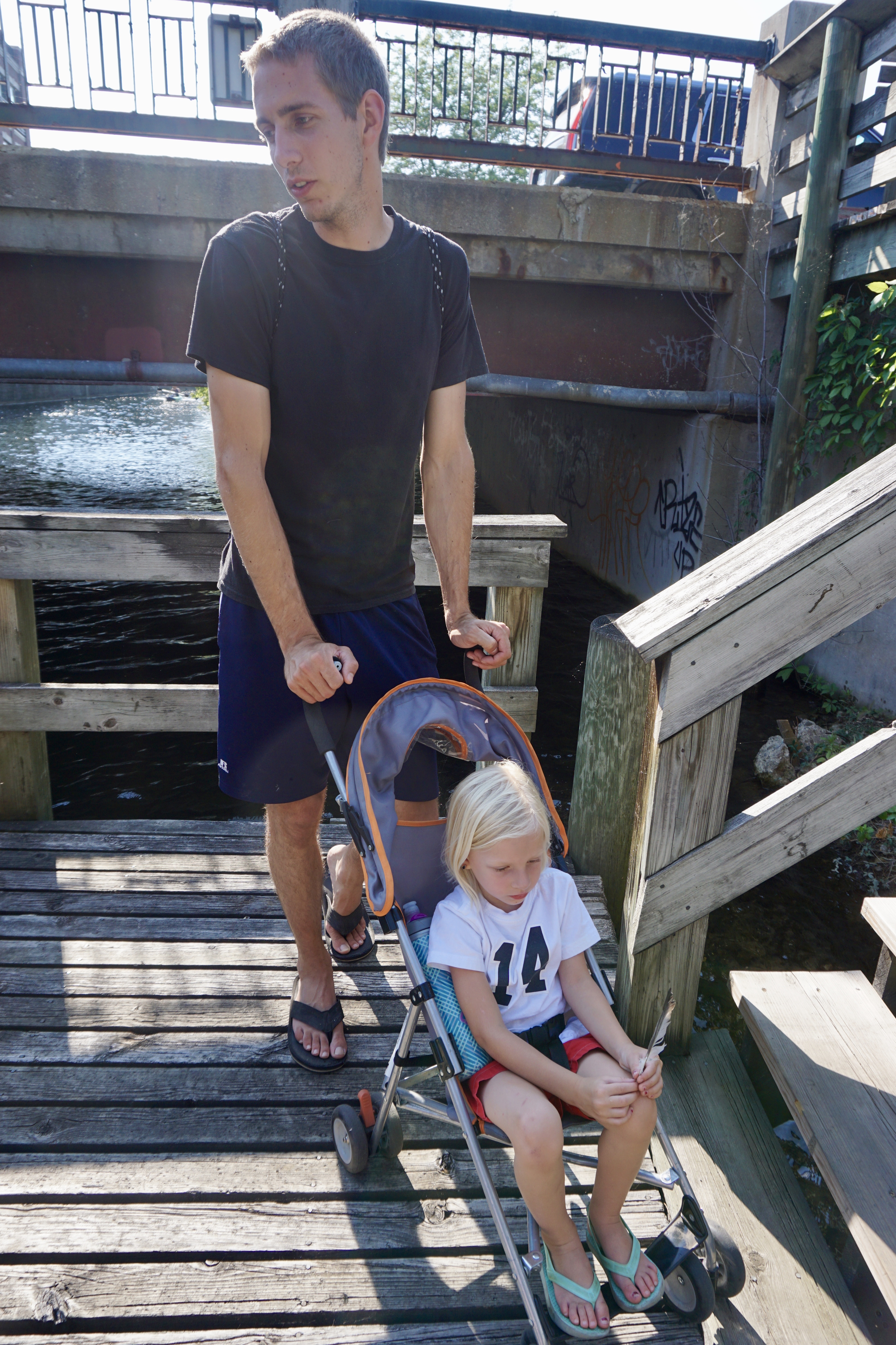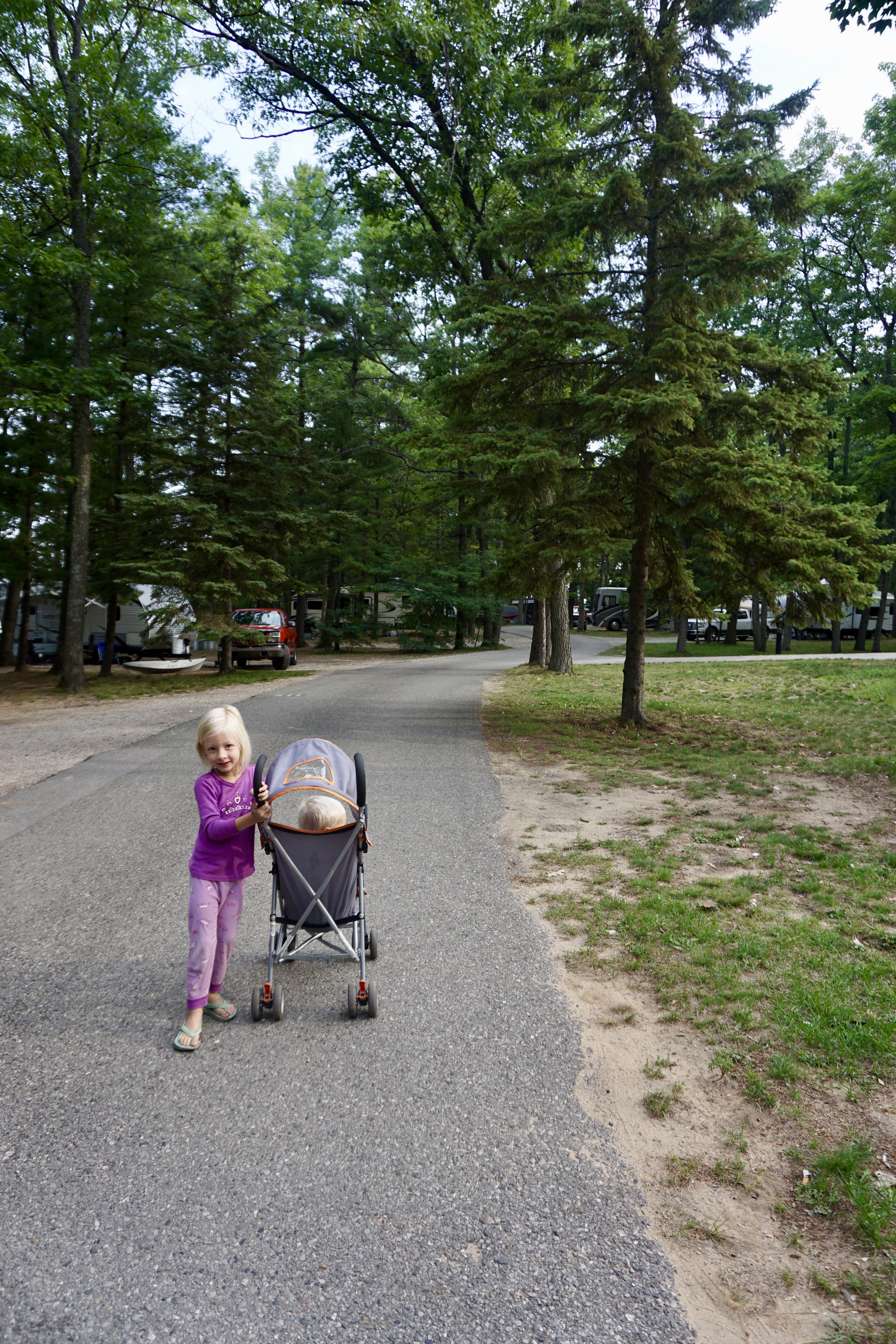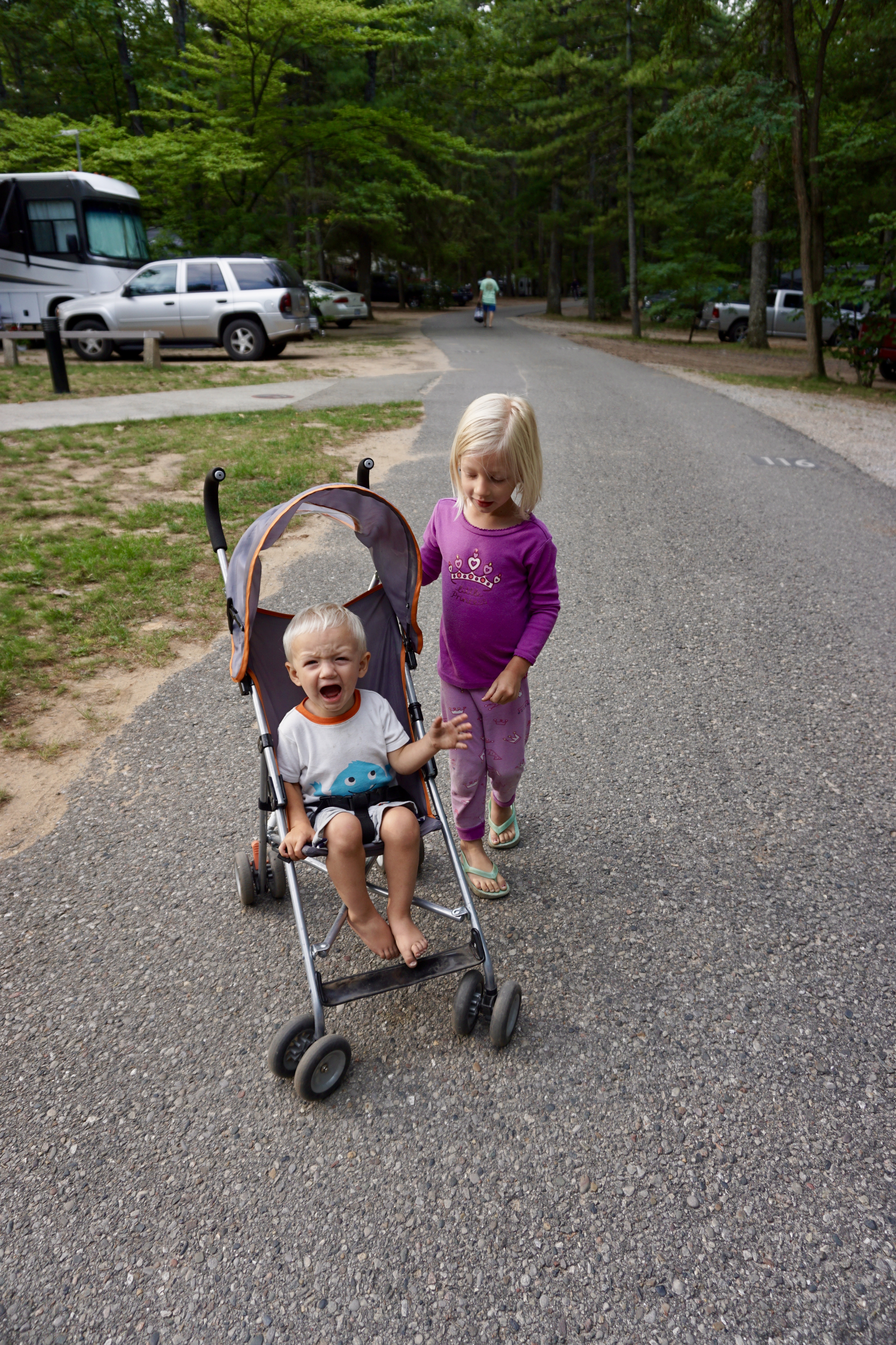 And look at this. My perfectly capable four year old sitting in the stroller, with her shirt on backwards and a pair of her brothers shorts. We had so many potty accidents at this point, and we had already used up most of the clothes I had brought. We were so tired and getting hungry.