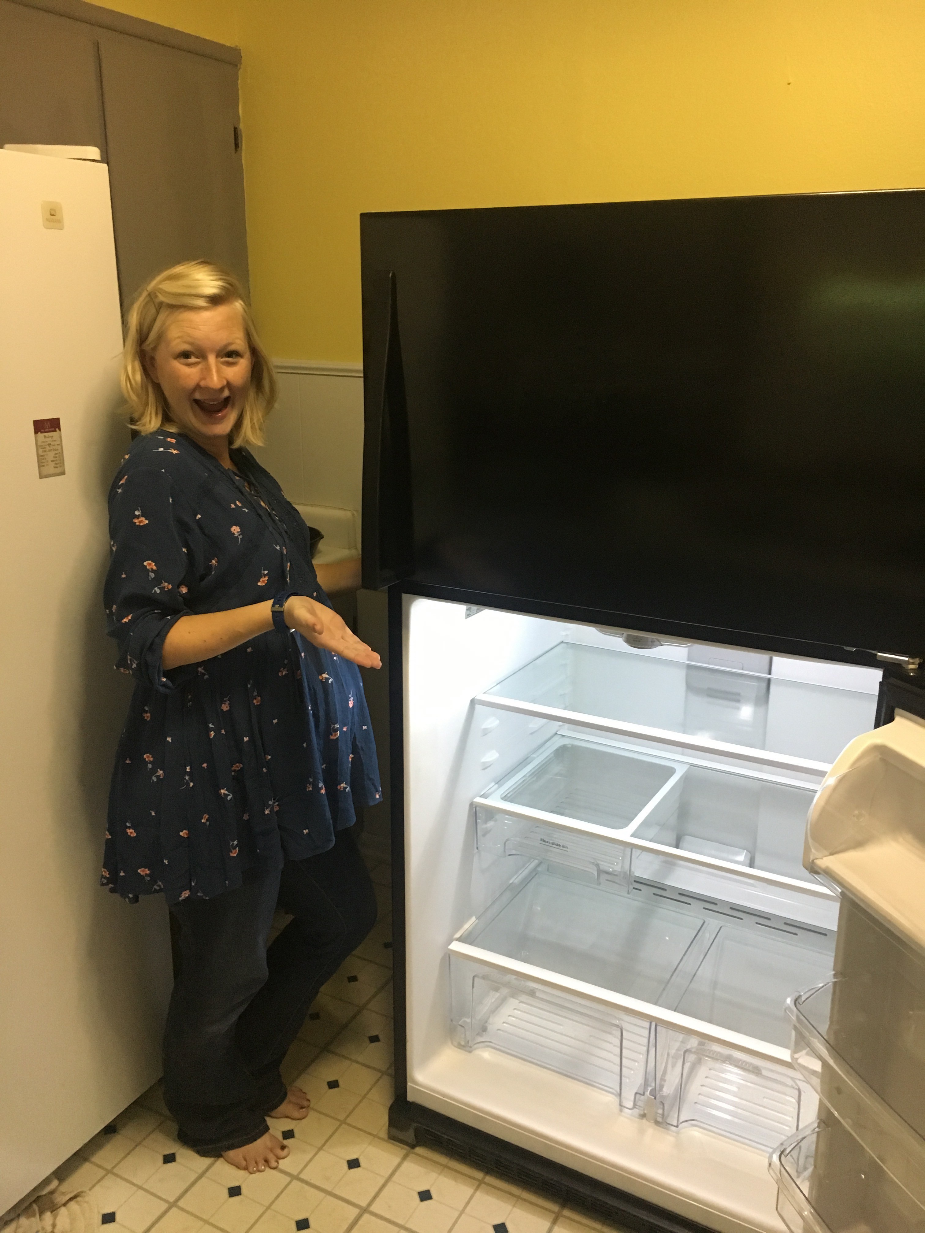 The fridge in our kitchen was starting to leak water under the door, which we thought was probably not a good sign for a fridge. It was in our house when we bought the house, and I’ve hated it since the day I saw it. However, if a fridge works perfectly well I’m not the type to get rid of it simply on looks. I’ve wanted a smaller black fridge with the freezer on top instead of side by side for a long time, and Theo found this one on Craigslist! He then proceeded to get it inside our house ALL BY HIMSELF. It took him a few hours and a few tricks (and $30 spent on a dolly at the store), but he got it in!
