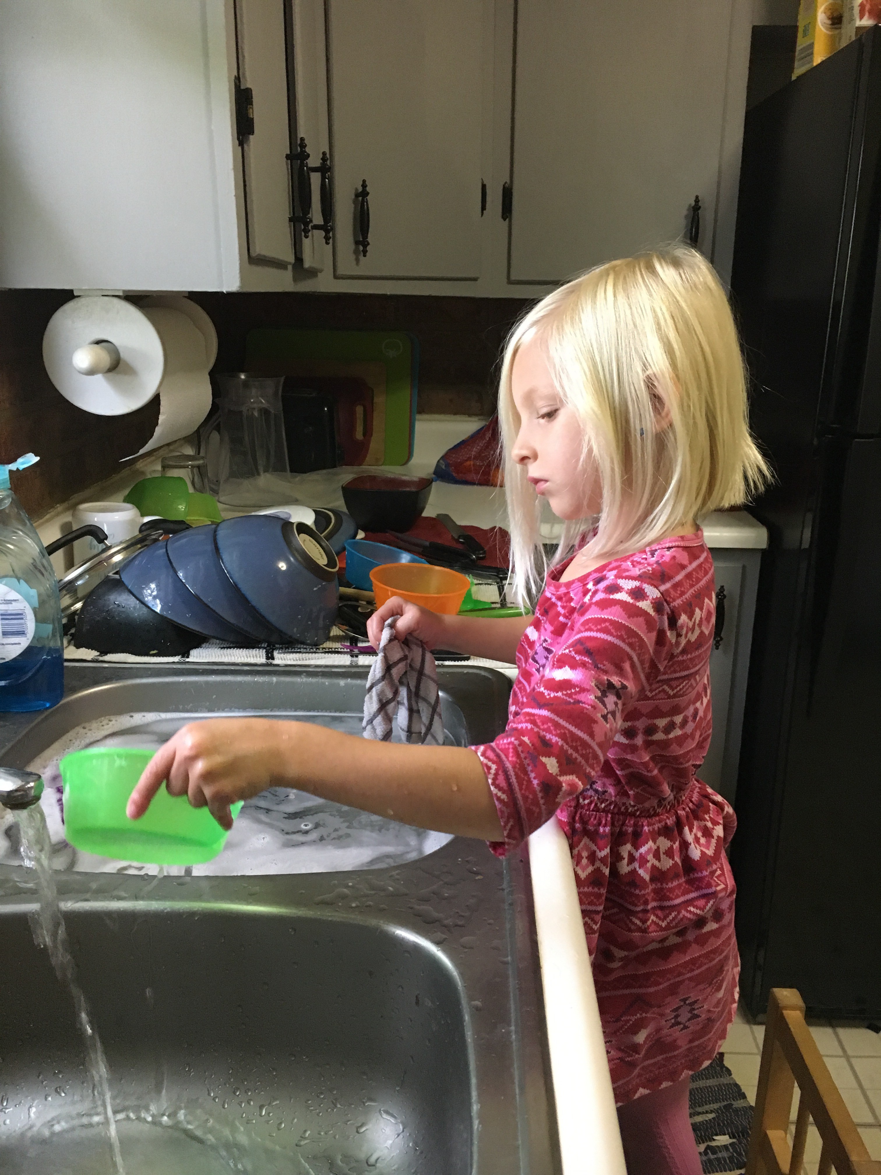 I decided it’s time for Tera to start doing the dishes! She does all the plastic dishes from breakfast and lunch, and so far it only takes her approximately 5 minutes a dish. I’ll thank myself in 3 years.
