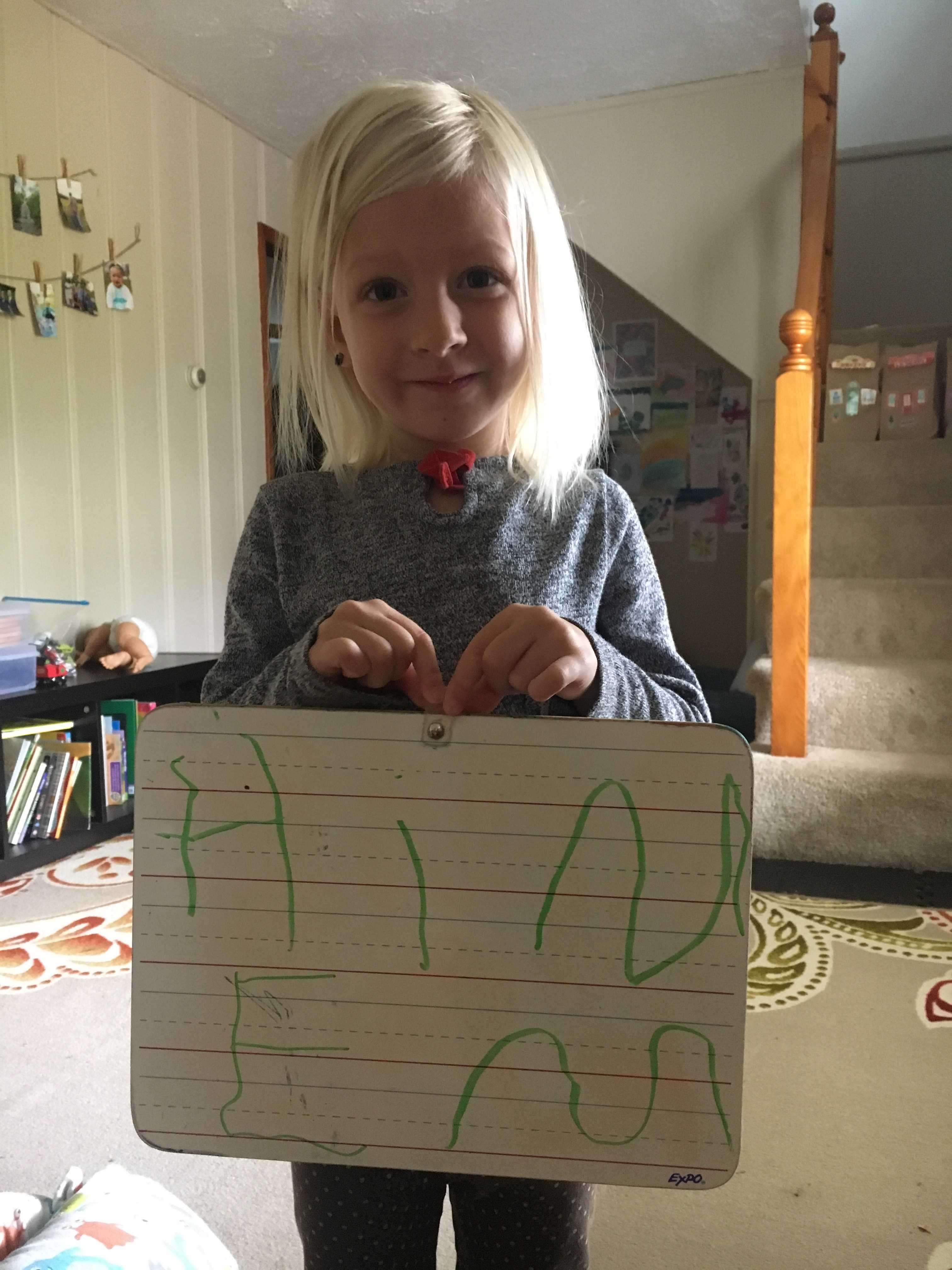 Tera asked me how to spell “HINES” and when I spelled it out loud for her, she wrote it all by herself. Obviously, there is still work to be done, but I am SO PROUD of my girl and how incredibly smart she is. She also has her sweater on backwards because she insists on wearing the red bow in the front. So, this sums up my four year old in one picture.