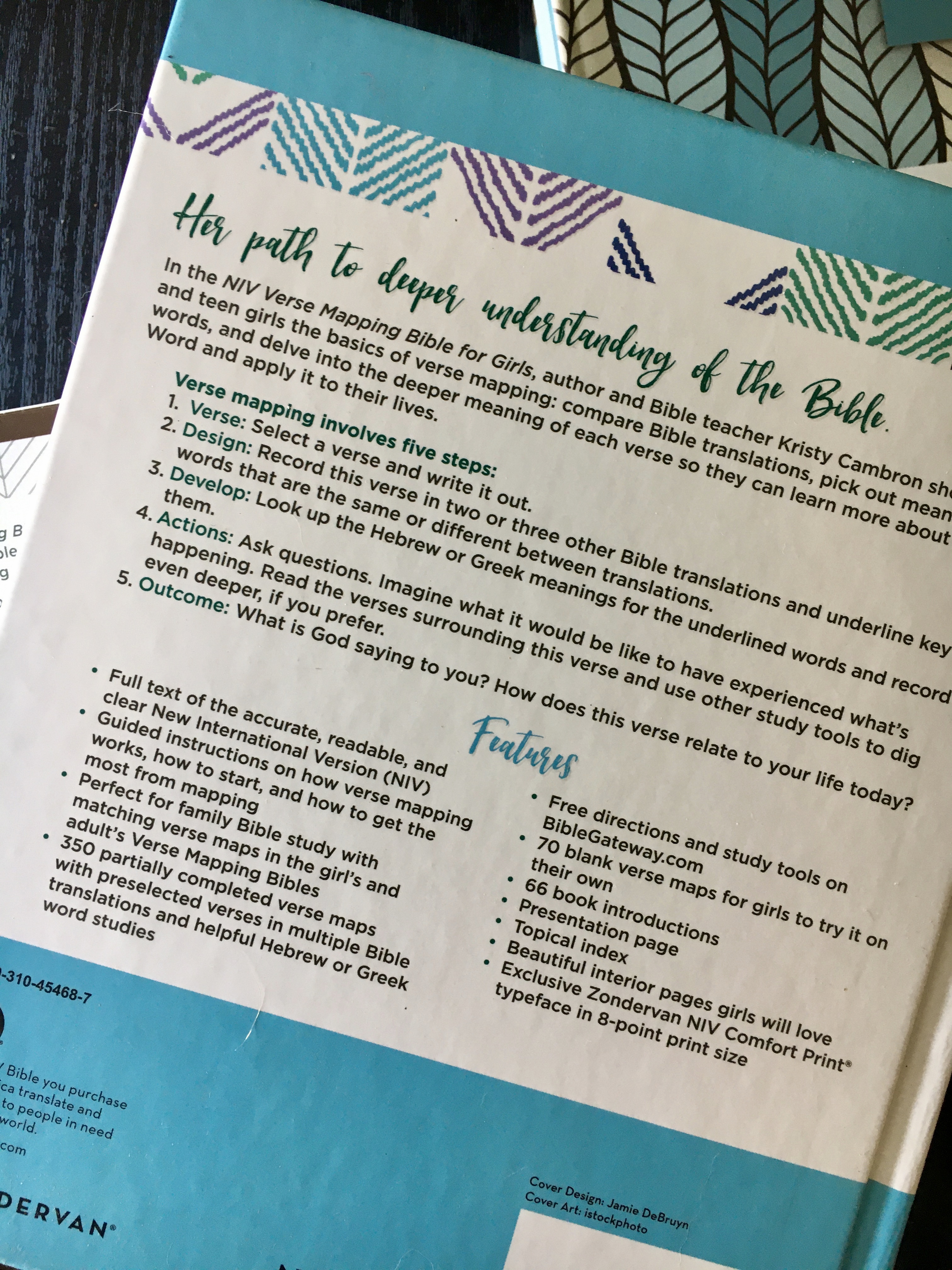 Each of the verse mapping Bibles is an NIV Bible that has 350 partially completed verse maps throughout the Bible. The Girls NIV Verse Mapping Bible has a fun cover but is otherwise the same as the NIV Verse Mapping Bible. Both Bibles have already selected the verses (within the Biblical passage) and given some of the Greek and Hebrew words to study. The actions and outcome are left up to the reader. I love how the Bible guides the verse map but still allows plenty of room for personal study.