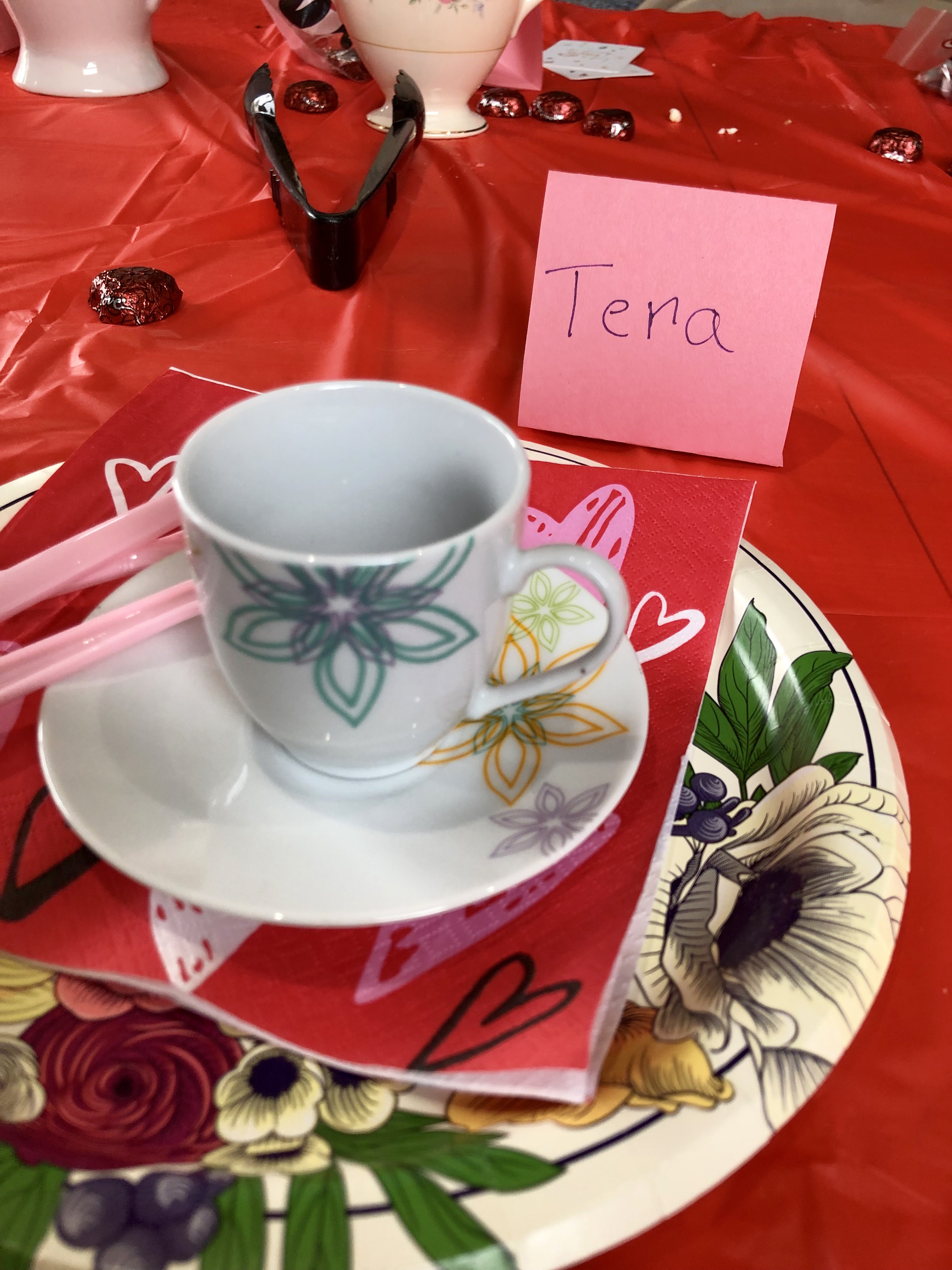After our tea party, my Mom and I cleaned up the table while all the guests headed to the living room to make some Valentine cards for loved ones or play with the pets around the house.